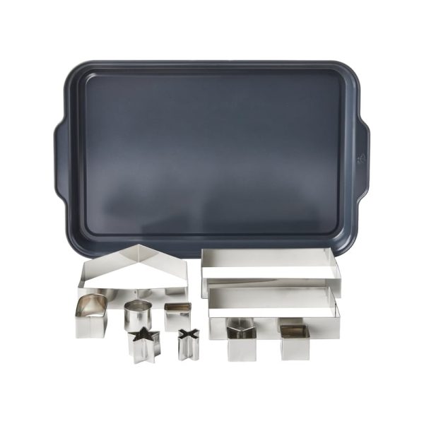 - Includes 10 house-shaped cookie cutters, 1 non-stick cookie sheet, and assembly instructions
