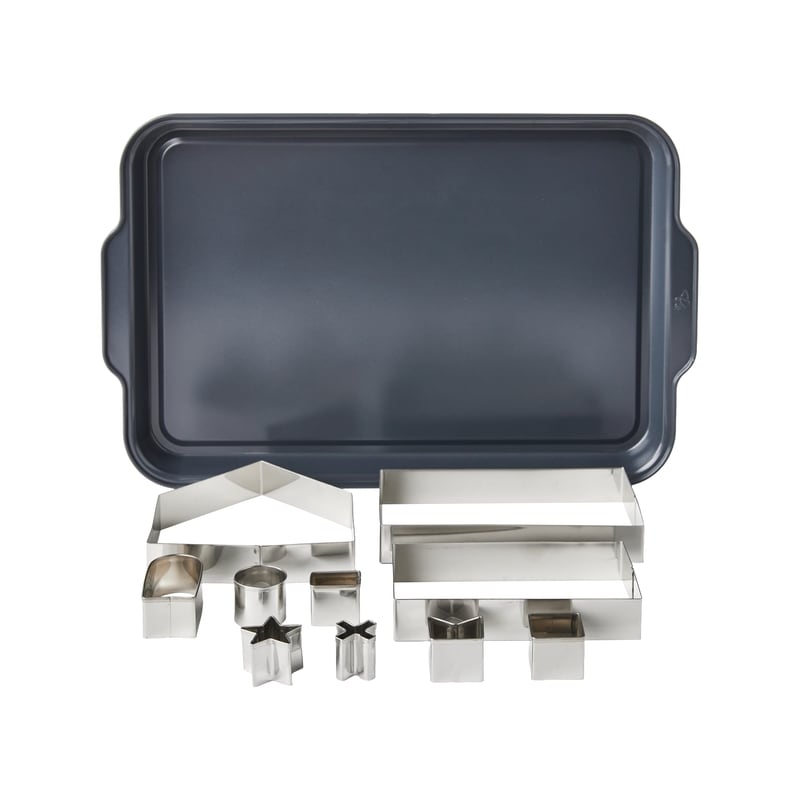 - Includes 10 house-shaped cookie cutters, 1 non-stick cookie sheet, and assembly instructions