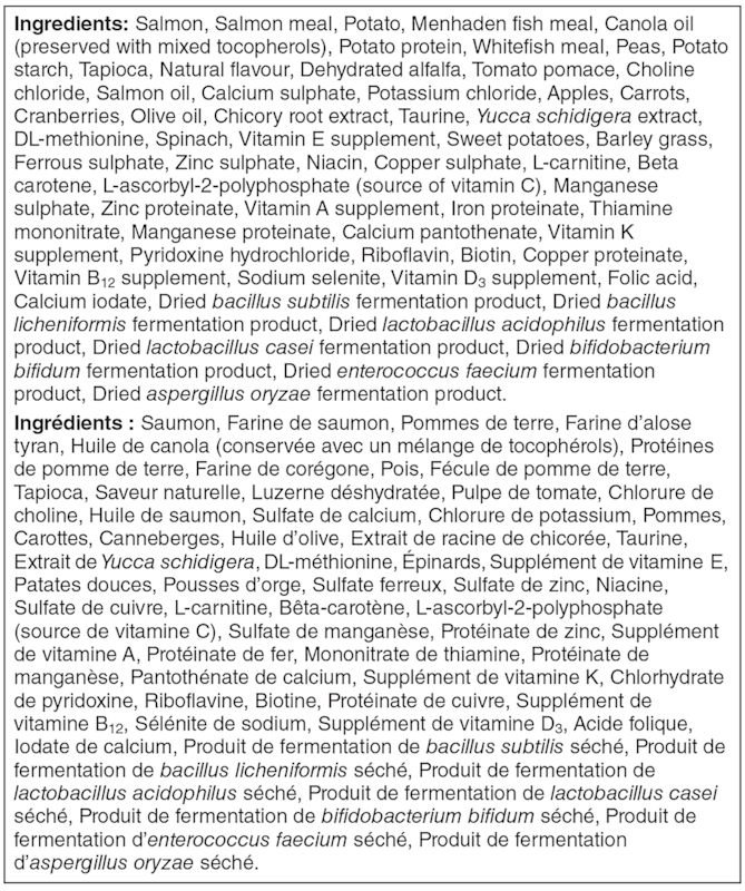PC® Nutrition First® Grain Free recipes are specifically developed to support pets with an inability to digest grains. This complete and balanced recipe forms the foundation of the PC® Nutrition First® Grain Free pet food collection. Added supplements and plants provide additional benefits to support your pet’s overall health: Taurine – an essential amino acid supporting eye and heart health. Yucca schidigera – a plant to help reduce fecal odour. Chicory root – a prebiotic source to promote a healthy gut. Peas – a source of minerals, vitamins and fiber. Packed with real salmon as the first ingredient and nourishing fruits and vegetables, our wholesome recipes contain essential nutrients to help your pet live a healthy grain free life.