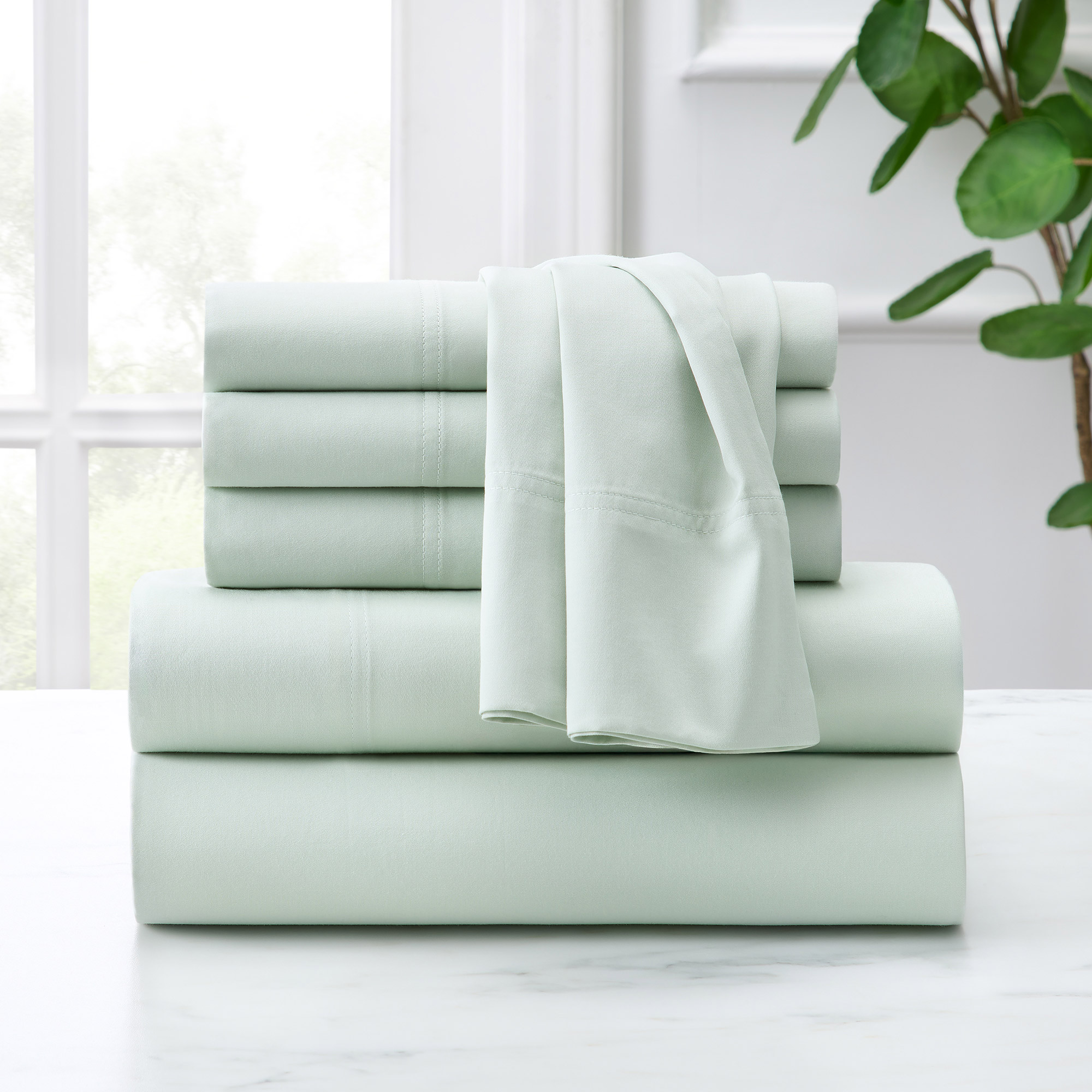 - Set includes: 1 flat sheet, 1 fitted sheet, 4 pillowcases