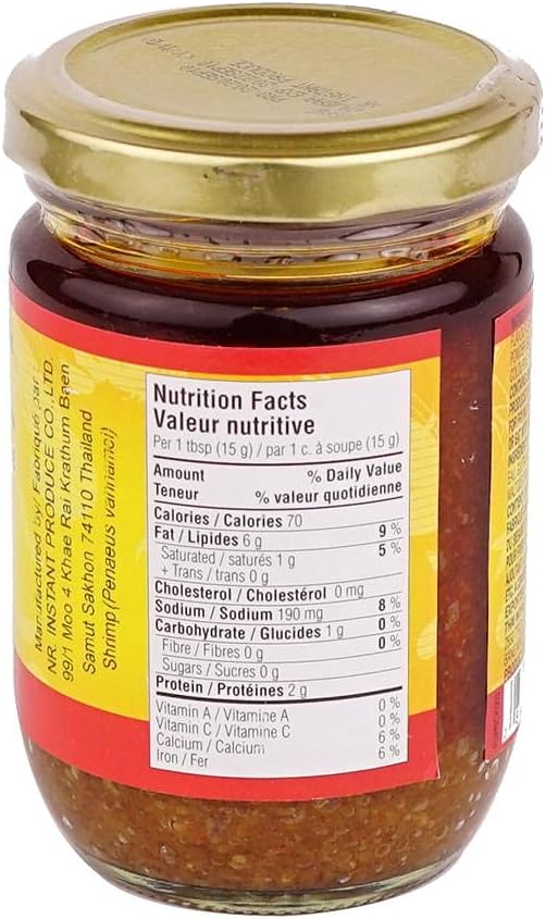 Made in Thailand, this shrimp paste contains 41% soy bean oil, 20% cooked shrimp and flavours such as soy sauce powder, garlic, monosodium glutamate, salt, pepper and food additive paprika oleoresin (E160c). Shrimp paste (also called prawn sauce) is a fermented condiment that is traditionally made from krill or crushed fine shrimp that is mixed with salt. After it is mixed, it is then fermented for several weeks. It is used in a wide variety of Southern Chinese and Southeast Asian dishes, especially curries, sambals and sauces. The best way to cook it is to flatten the paste in a frying pan on medium-low heat. This product is GMO-free and should be used sparingly as it has a strong odour and can be very salty. For those with any allergies, please note that this paste contains shrimp (shellfish) and soy bean. Remember to refrigerate after opening. It comes in a 200 gram jar.
