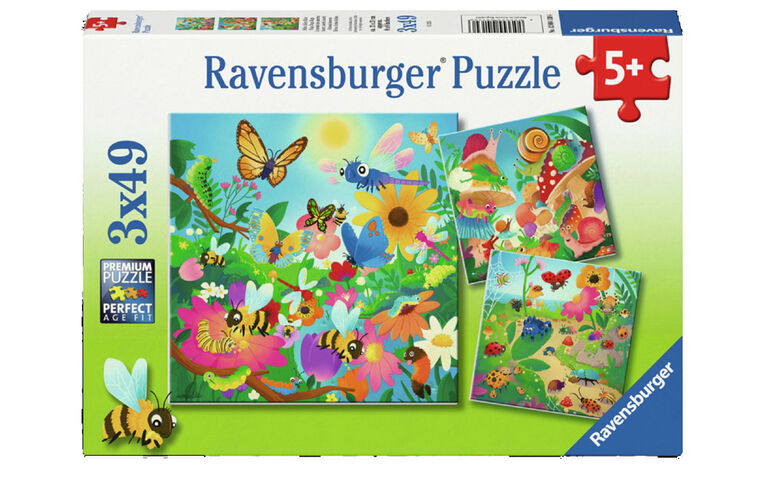 Bugs, Bugs, Bugs 3x49p. Discover the perfect fit! Ravensburger has the perfect puzzle for every child. With interesting motifs and strategic piece sizes, as well as a variety of formats, success is guaranteed for all age groups and levels of difficulty. Enjoy Ravensburger quality with this family-friendly activity! From 5 years.