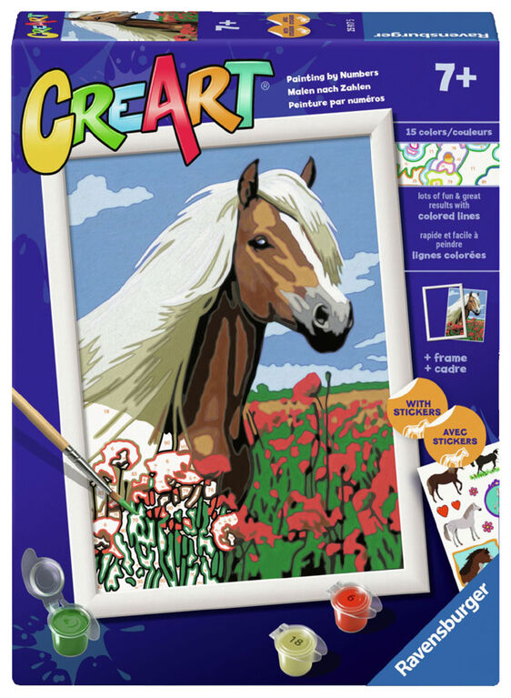 CreArt contains everything children need to create their painting: a high-quality, thick painting board; 15 water-based opaque acrylic paints in numbered pots; 2 pallets to hold the easy-open/resealable paint pots steady; durable, fine-point paintbrush; easy-to-follow reference sheet; fun horse stickers, and a frame to display their finished artwork. Makes a great gift!
