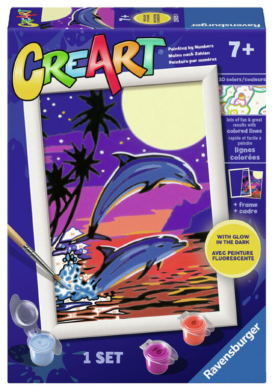 Shine a light on your child’s creative talent with our glow-in-the-dark “Dolphin Adventures” CreArt Painting by Numbers set!
