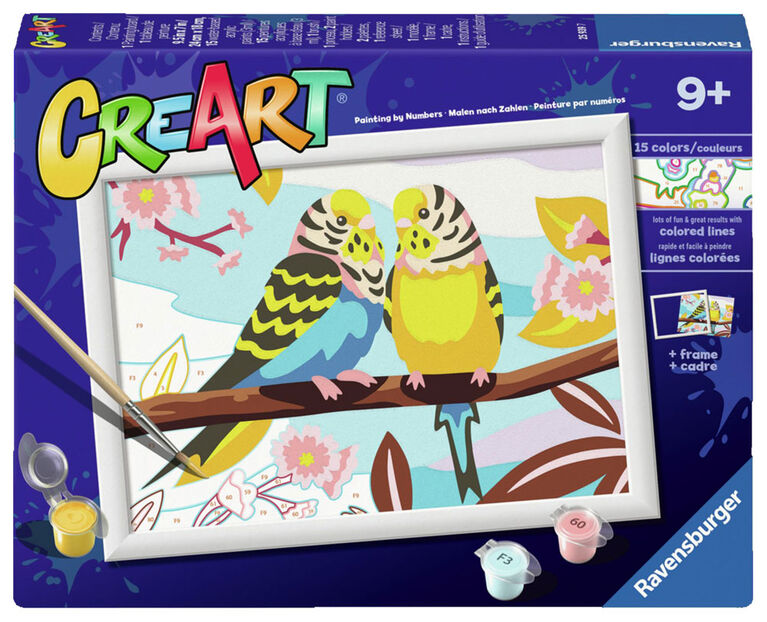 Watch your child’s creativity fly high with our bright and cheerful “Lovely Budgies” CreArt Painting by Numbers set!