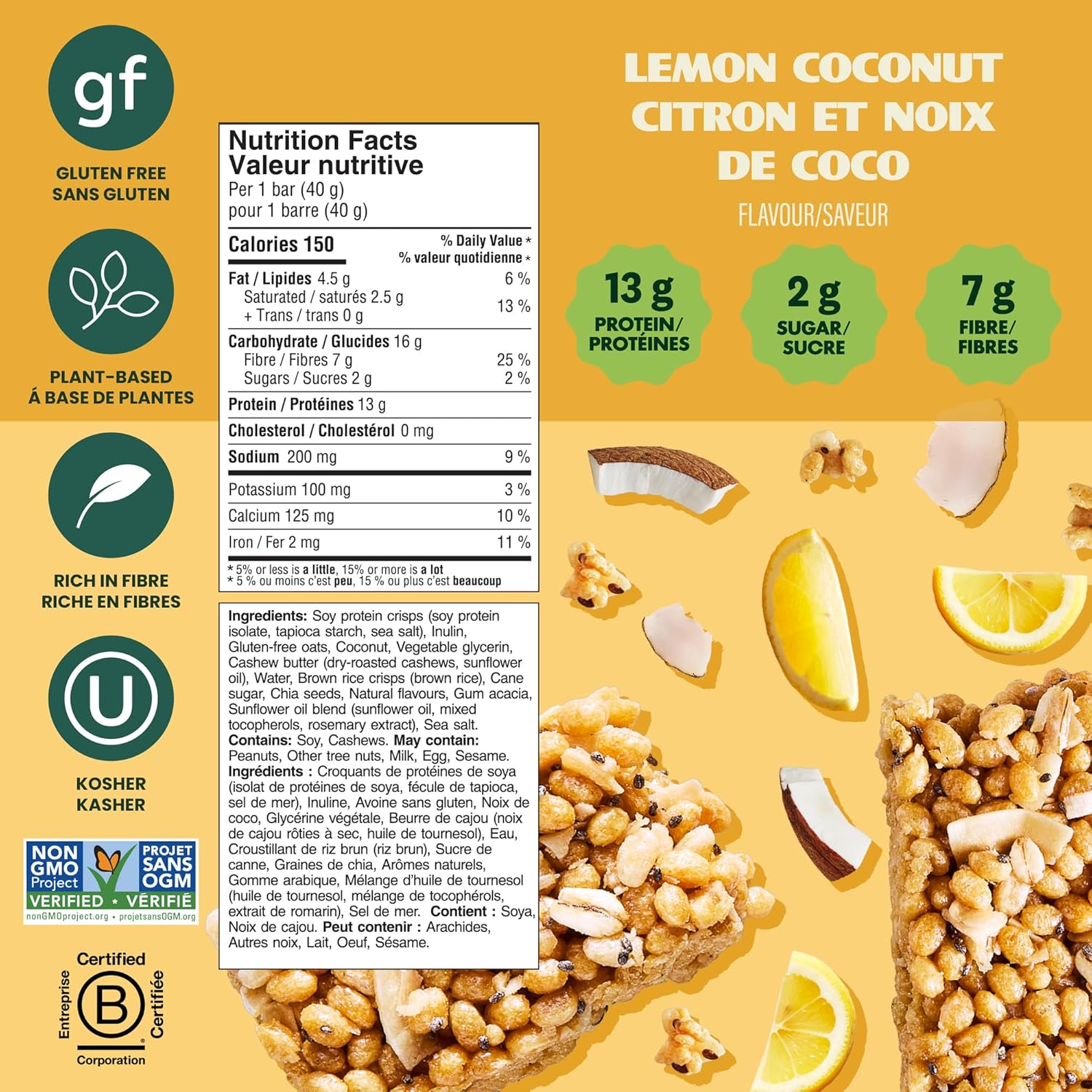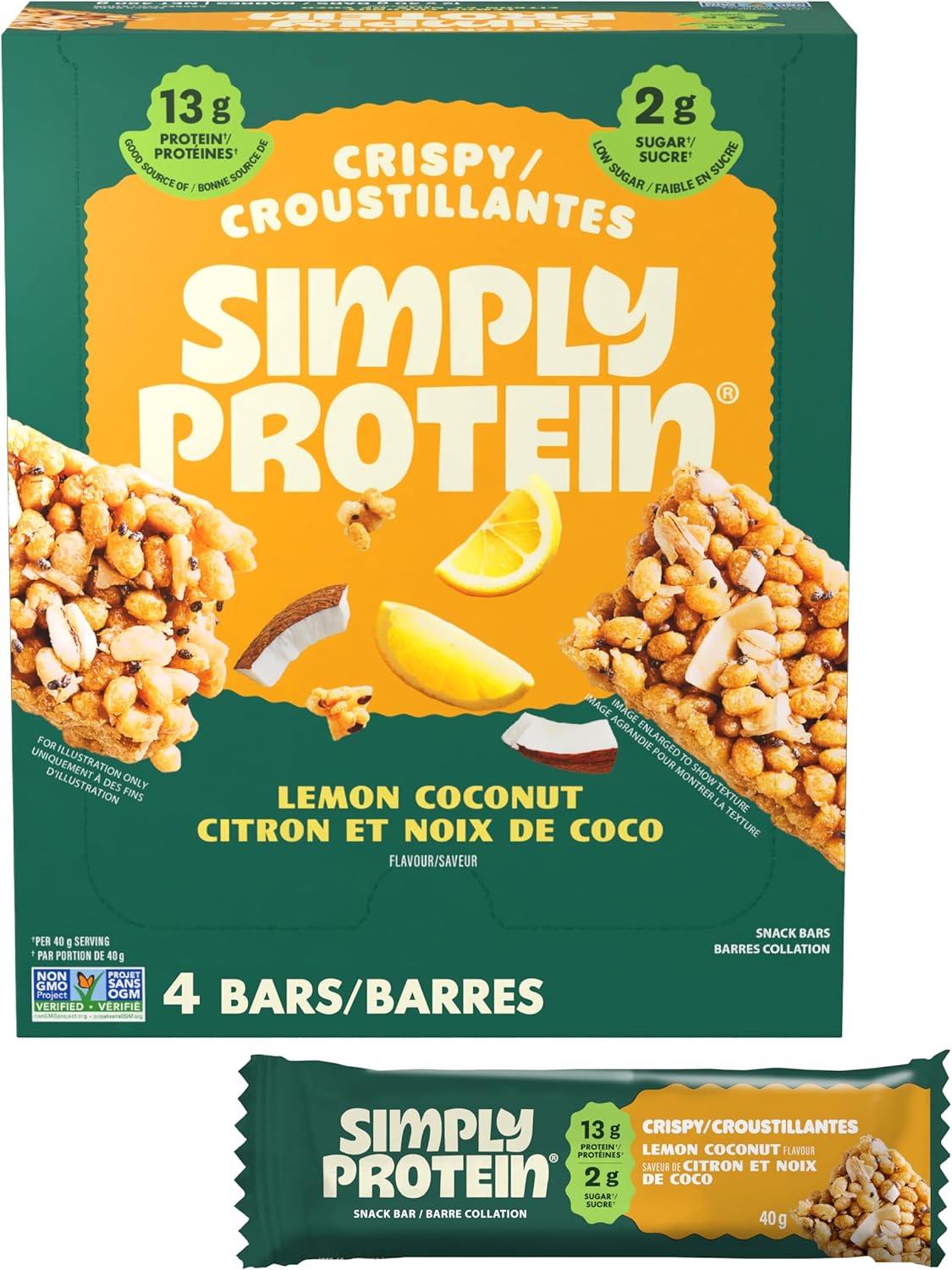 Simply Protein – Lemon Coconut Crispy Bars – Plant Based Protein Bars – Low Carb, Low Sugar, High Fibre – 13g Protein, 2g Sugar, 7g Fibre – Vegan, Gluten Free, Non GMO, Kosher – 4 Bars