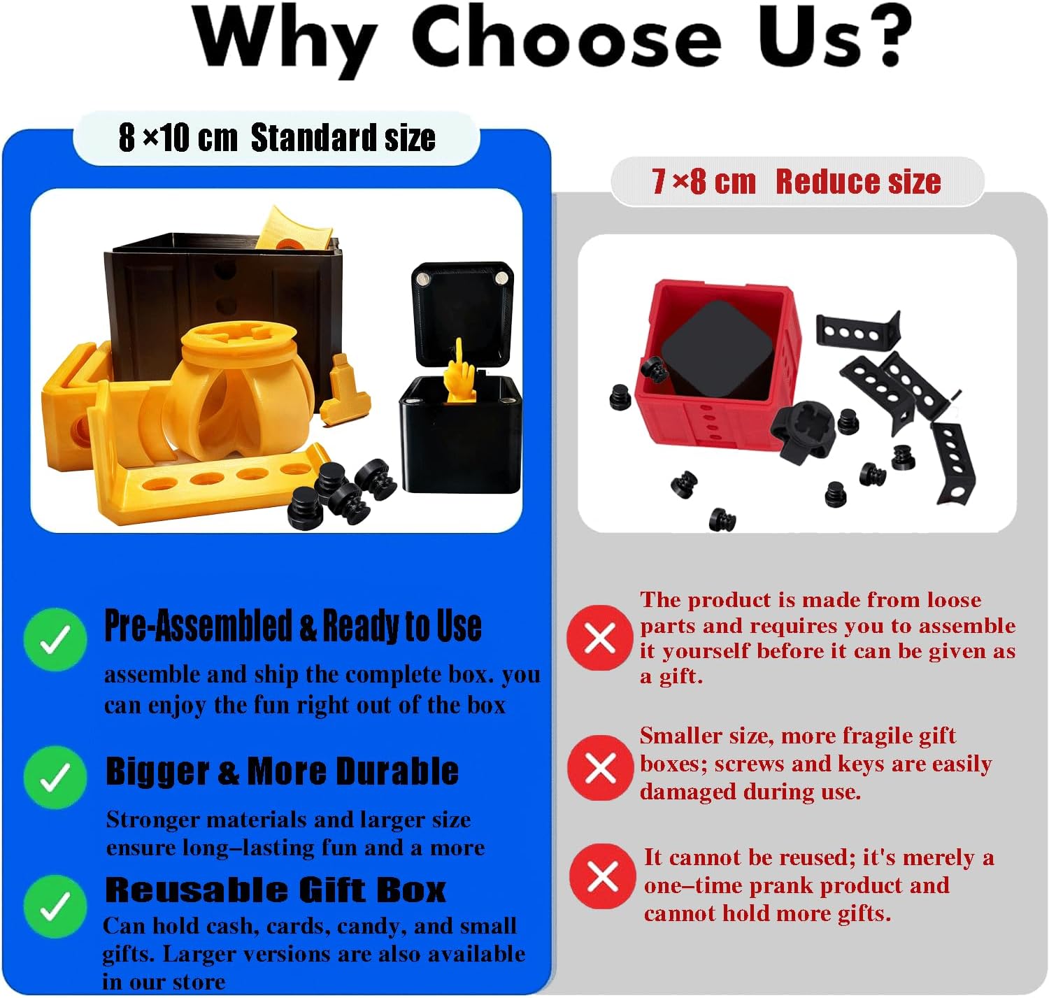 - 【Revolutionize Pranking】 A hilariously annoying present! The surprise pop-up mechanism and bold design make it a standout gag gift for adults, while the included screws add a DIY twist. Ideal for Christmas pranks, office shenanigans, or birthday surprises, this novelty gift box ensures laughs every time