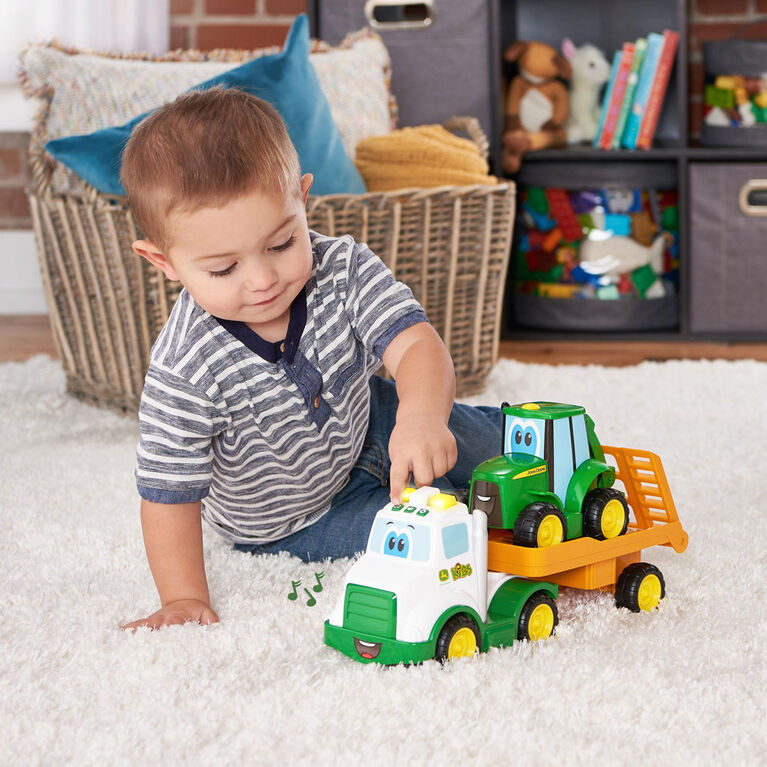 Help your little one get their farm friends from job to job with the John Deere Lights and Sounds Farmin’ Friends Hauling Set! This fun farm duo includes a truck with a ramp that raises and lowers, making it easy for the tractor to roll up on board. The hauler truck features lights and sounds for extra fun during playtime and can also be used to haul other Johnny Tractor vehicles. Both toys have free rolling wheels for plenty of push along fun.