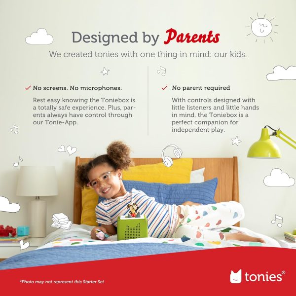 - Starter Set includes a red Toniebox, charging station, and bilingual Playtime Puppy Tonie with 104 minutes of most popular traditional children's songs for playtime presented in French and English. Additional Tonies can be purchased separately.