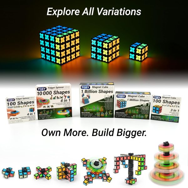 - TRANSFORMABLE FIDGET SPINNER – Featuring 136 magnets (eight embedded in each block), the TOSY Magnet Fidget Spinner Glow lets you create various fidget spinner shapes. Rotation is smooth with a stainless steel bearing, making it spin longer than others