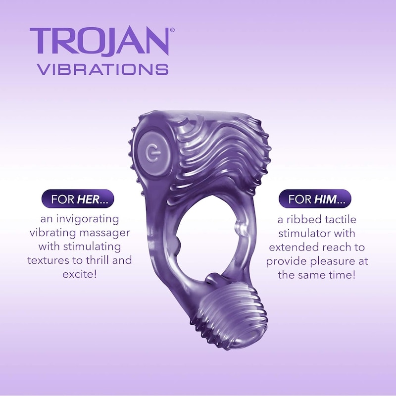 Pleasure got just better with Trojan vibrations Tandem Couples Vibrating Ring. Designed to stimulate both partners simultaneously, tandem breaks bedroom bounds, making for pleasure that really lasts! The Trojan brand is Canada’s #1 Sexual Health brand and promotes a safe, healthy, and fun sex life. From condoms to vibrators to lubricants, Trojan is dedicated to delivering innovative, high-quality products that offer pleasure and protection.