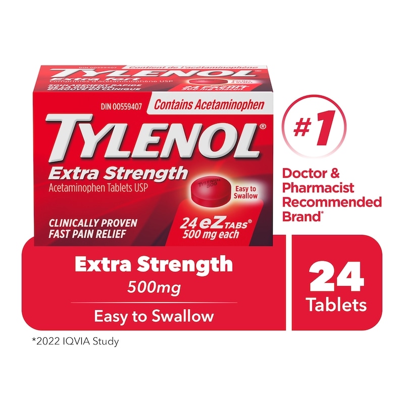 Get fast relief of headaches, aches and pain, and fever with TYLENOL Extra Strength 500mg EZTABS that are tough on pain, but gentle on your stomach. Containing 500 milligrams of acetaminophen in each tablet, TYLENOL Extra Strength offers fast and effective relief of pain and fever. These easy-to-swallow tablets act quickly to provide effective relief of headache, tension headache, mild to moderate migraine pain; pain of mild to moderate arthritis pain, minor muscle sprains and strains, menstrual cramps and aches and pains due to cold and flu.