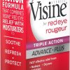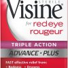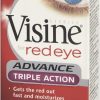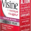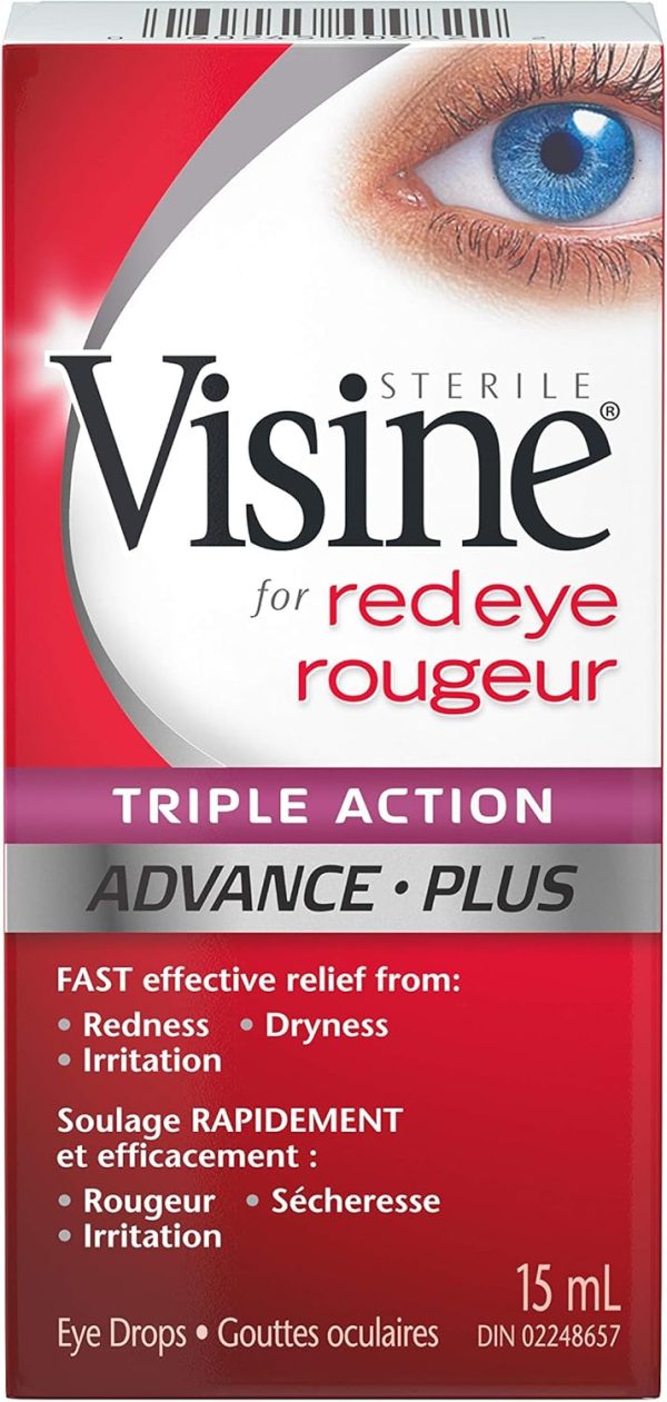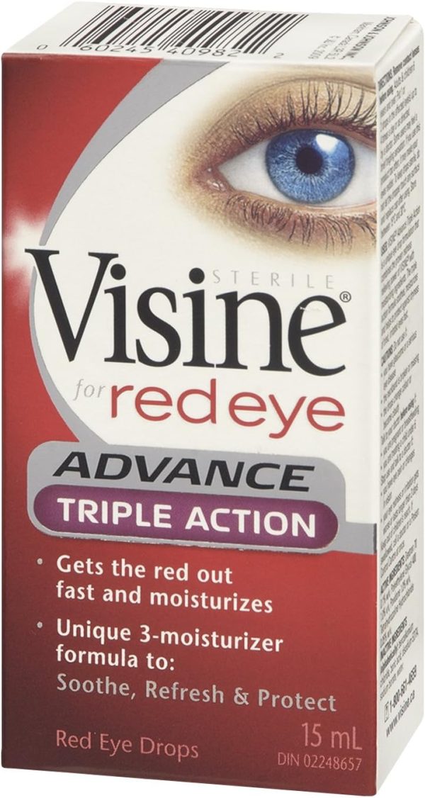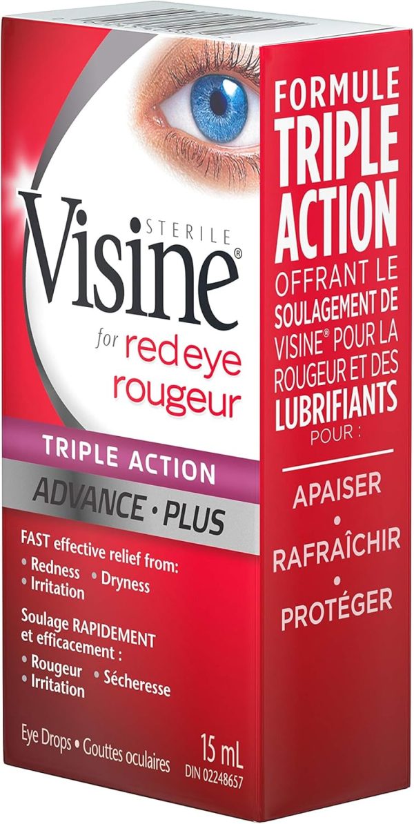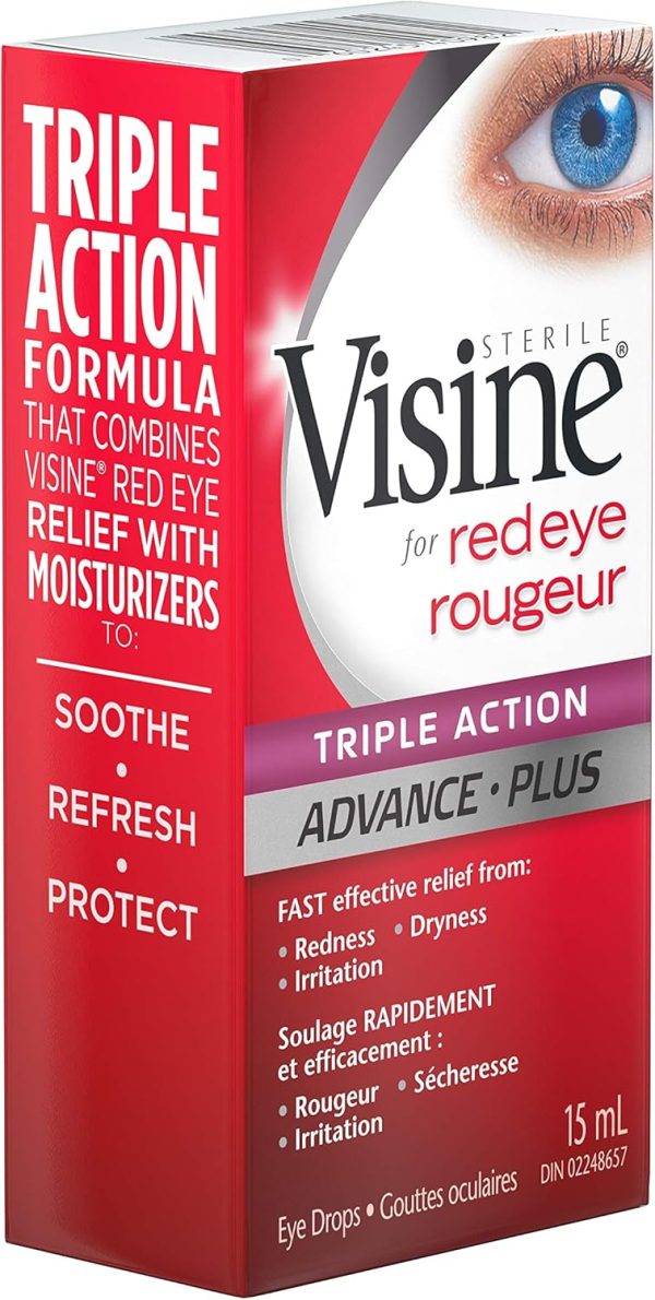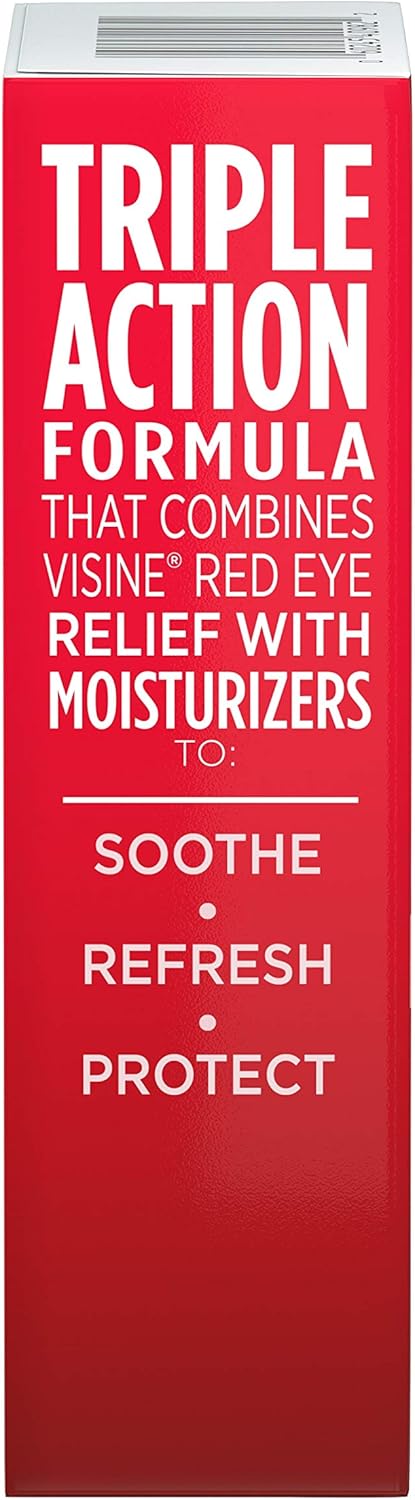 - Soothe, refresh, and protect dry, red, and irritated eyes with Visine Triple Action Eye Drops. These triple action eye drops combine Visine Red Eye Relief with moisturizers. This product comes with one 15-millilitre bottle of eye drops.