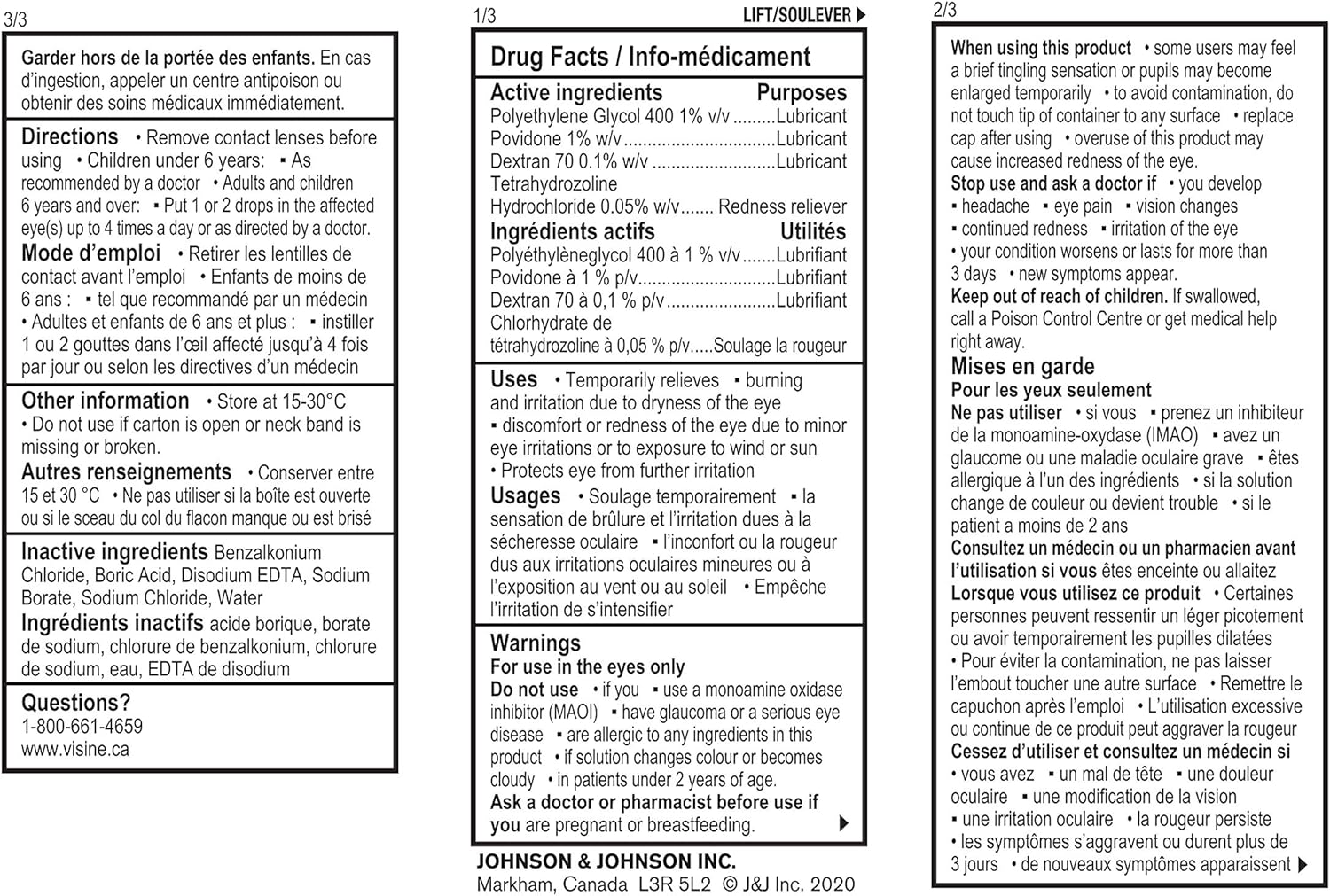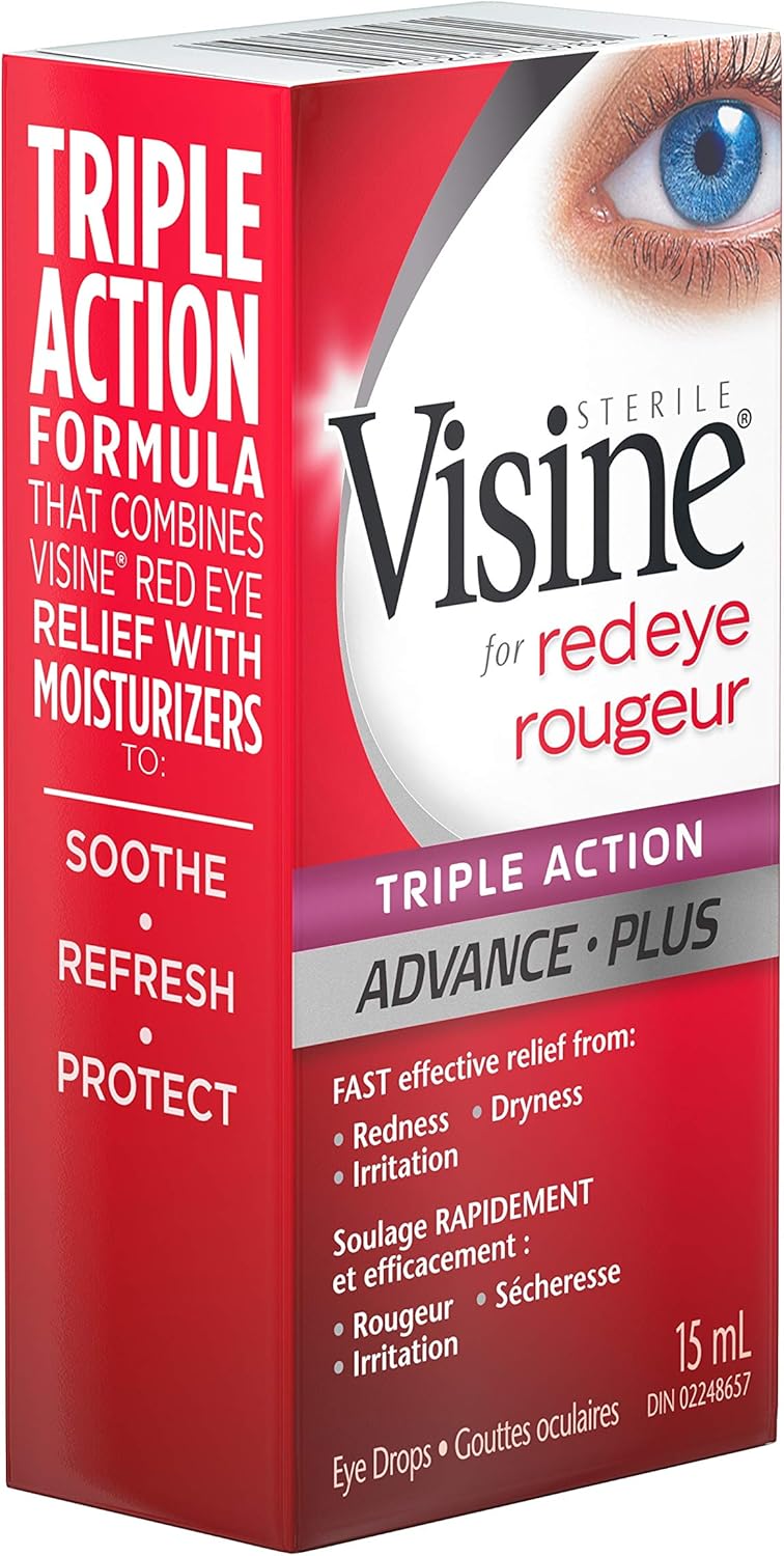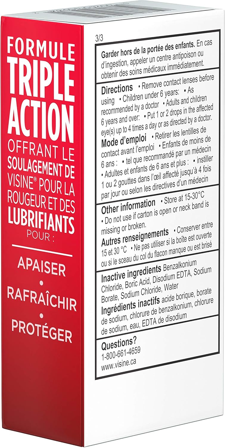 - Soothe, refresh, and protect dry, red, and irritated eyes with Visine Triple Action Eye Drops. These triple action eye drops combine Visine Red Eye Relief with moisturizers. This product comes with one 15-millilitre bottle of eye drops.