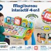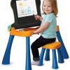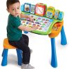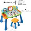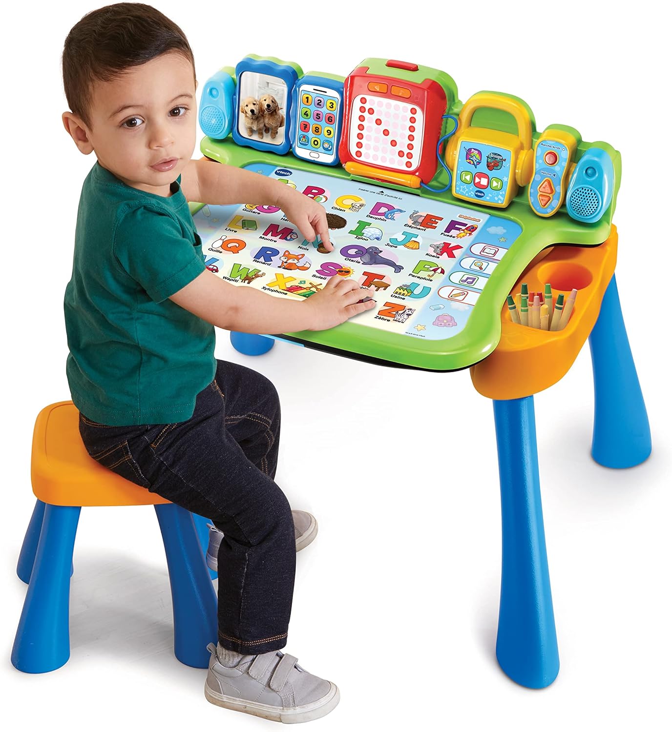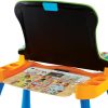 Learn and create with the Explore and Write Activity Desk™! This interactive desk features five activity pages filled with engaging content including letters, numbers, music, colors and more. The fold-down writing pad and light-up display encourage kids to practice writing by tracing letters, numbers and shapes with a stylus. The desk transforms into an easel and chalkboard with plenty of storage space for art supplies. Continue the play with expansion packs that each focus on a specific curriculum like nursery rhymes, reading skills, animals and numbers. Kids can also play with the touchscreen toy phone or listen to more than 20 melodies on the music player. (Art supplies not included.) Intended for ages 2–5 years. Maximum weight 75 pounds. Requires 4 AA batteries. Batteries included for demo purposes only. New batteries recommended for regular use.