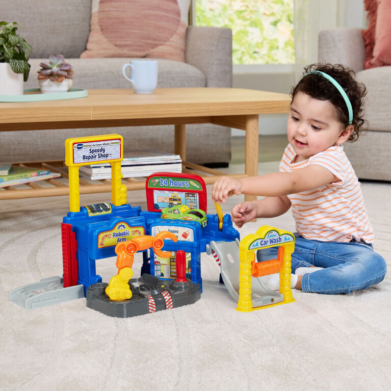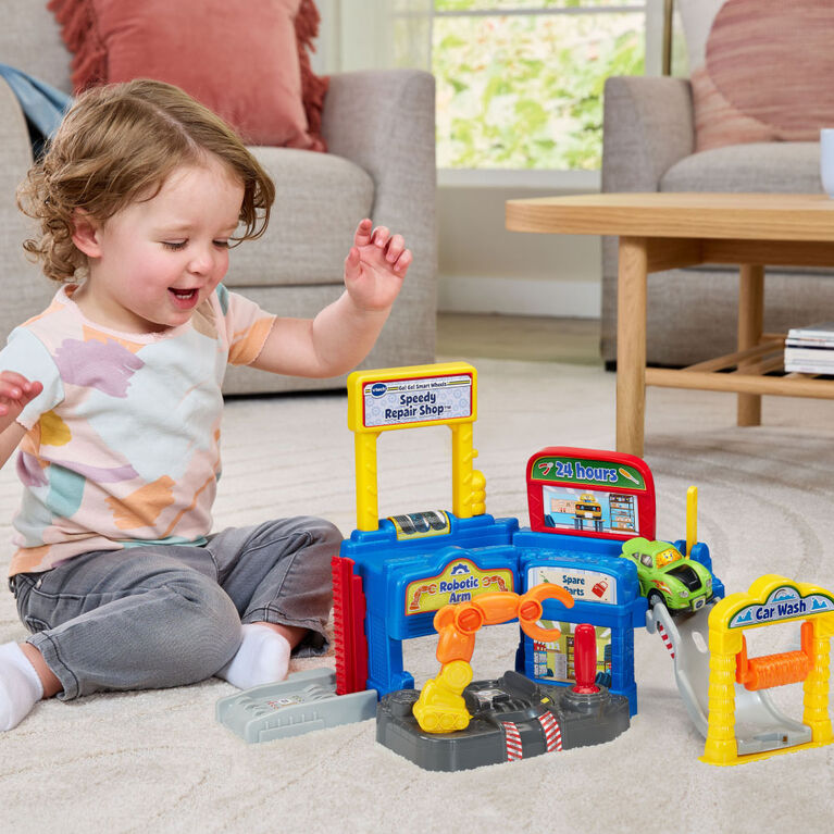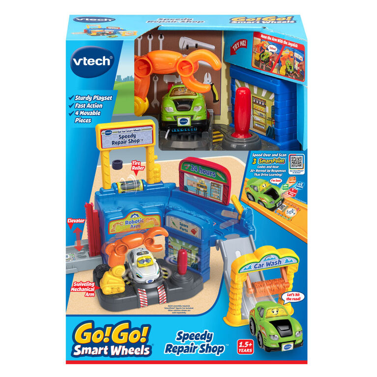 Whether you’re getting ready for the big race or need a tune-up, this high-tech shop has everything a car needs! Park the Sports Car in the repair area and move the joystick to activate the swiveling mechanical arm. Take the elevator to the top of the shop and launch the car down the ramp and through the car wash. While exploring the shop, drive over or park on three SmartPoint locations for revved-up responses. Hit the road and press the SmartPoint Sports Car’s windshield to introduce first words, songs and phrases that drive learning. Build up the town by collecting more SmartPoint cars and Go! Go! Smart Wheels track sets (sold separately). Intended for ages 1.5+ years. Requires 2 AAA batteries. Batteries included for demo purposes only. New batteries recommended for regular use.