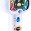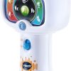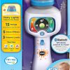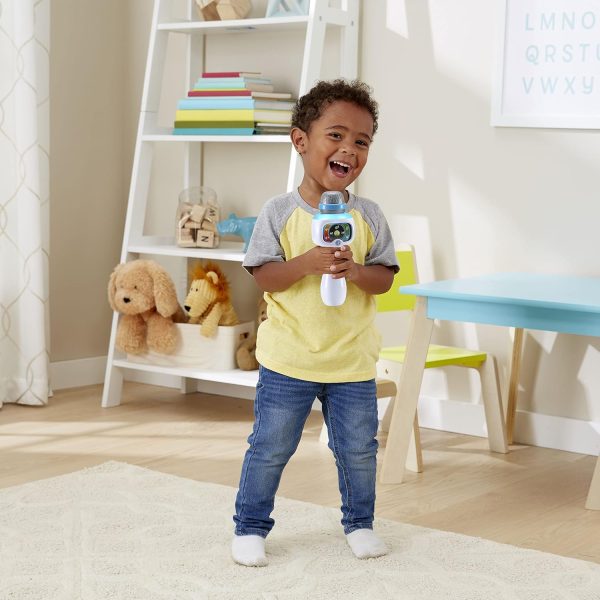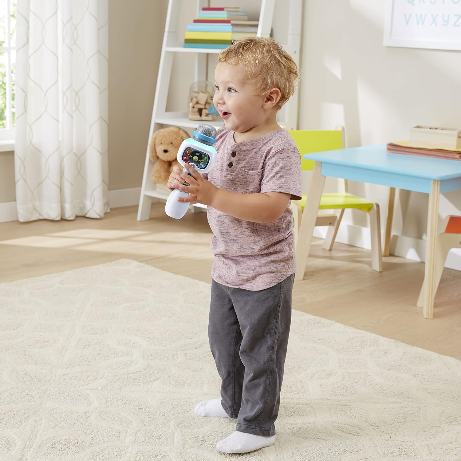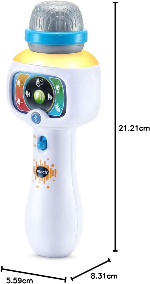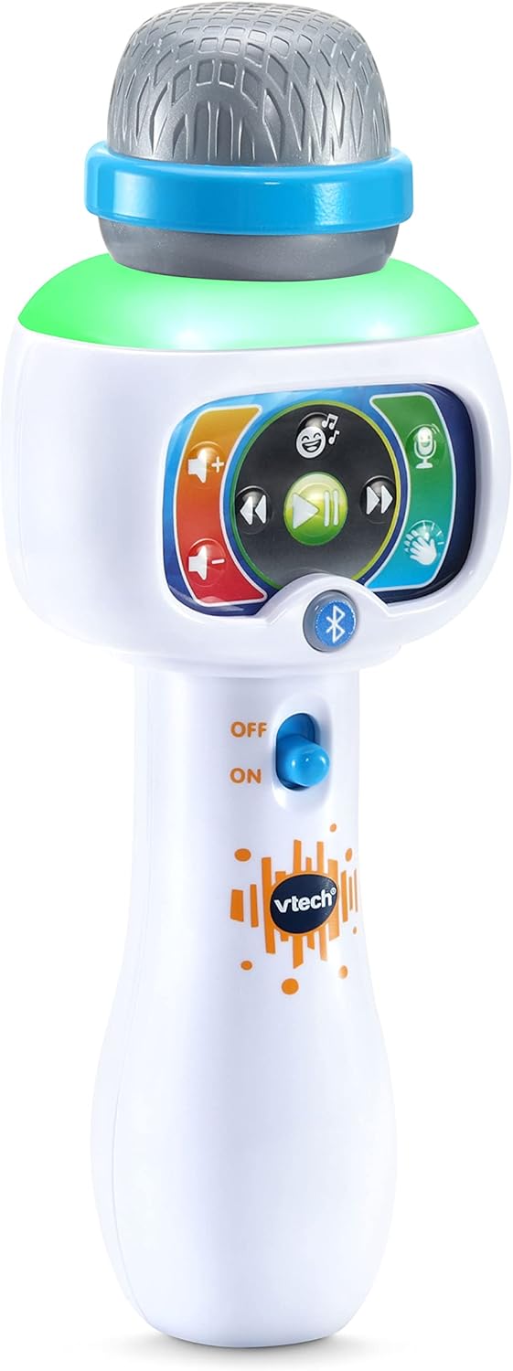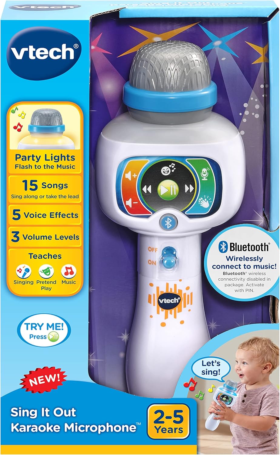 Take the stage and sing with the Sing It Out Karaoke Microphone! Let your vocals shine with this kid-size microphone. Sing along to the 15 included songs, then press a button to drop out the vocals when you’re ready to sing alone. Children’s favorites like “Twinkle, Twinkle Little Star” and “One, Two, Buckle My Shoe” make it easy for everyone to sing along to familiar songs. Party lights on the mic add pizzazz to your performance as they change color and flash along to the music. Use BLUETOOTH wireless technology to play your own music. Ready to mix it up? Hit the voice-changer button and try out five silly voice effects like reverb, echo or robot sounds to impress your audience. Hear the cheers as the microphone adds sounds and encouraging phrases. You are the star of the show! Intended for ages 2–5 years. Requires 3 AAA batteries. Batteries included for demo purposes only. New batteries recommended for regular use. Music player not included.