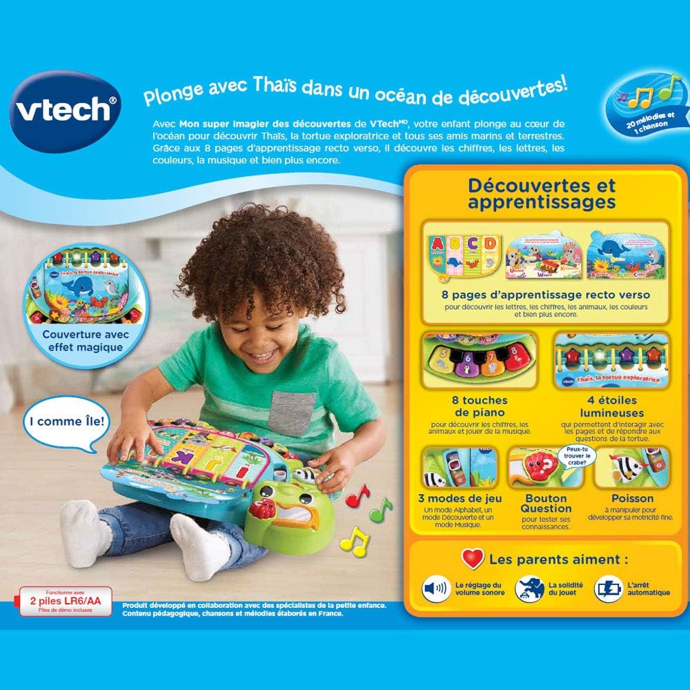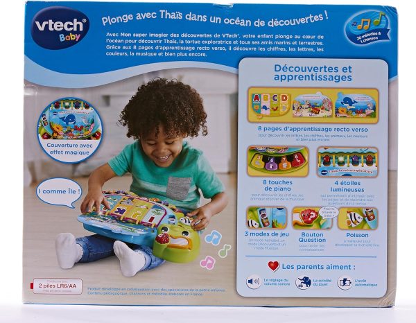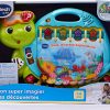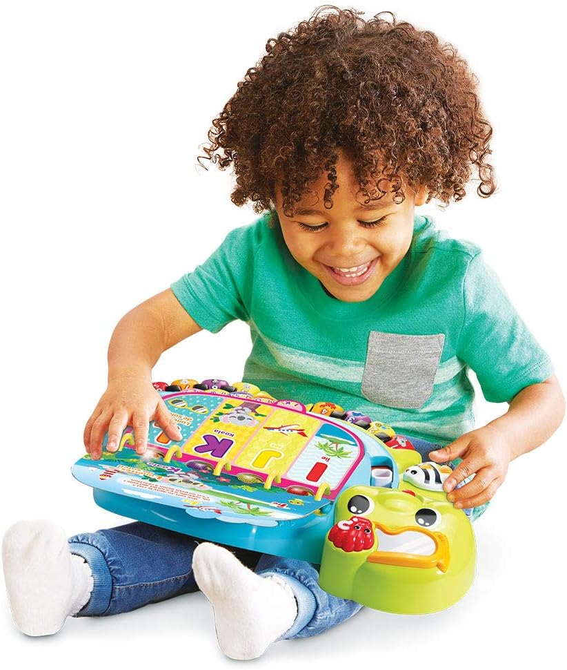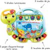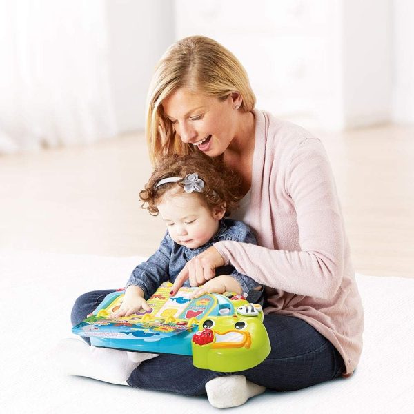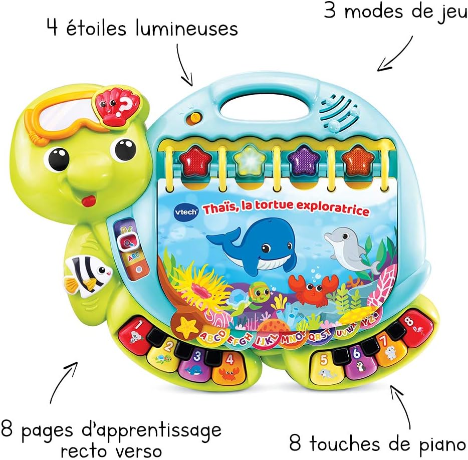 Dive into early reading with your toddler in the touch & teach sea turtle interactive story book. A holographic cover, bright colors and light-up buttons draw and hold your little one’s attention on eight double-sided book pages. Sea creatures fill this deep-sea story with learning experiences focused on letters, numbers, colors and animals with three learning modes. Press the piano key buttons on each page to hear the names of a variety of sea animals, listen to their sounds and practice counting. Go exploring with four light-up starfish and quiz questions that get little ones thinking and looking. Enjoy a robust 225+ songs, melodies, sounds and phrases in this take-along toddler book with carrying handle. Intended for ages 12-36 months. Requires 2 AA batteries. Batteries included for demo purposes only. New batteries recommended for regular use.