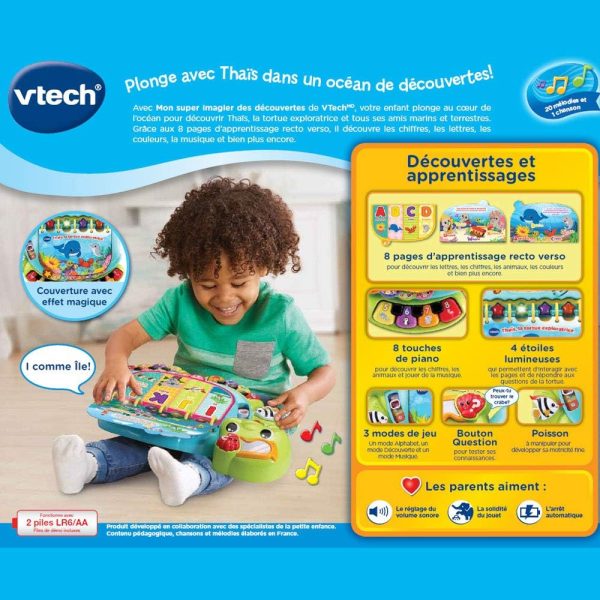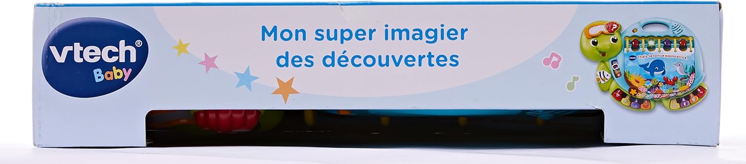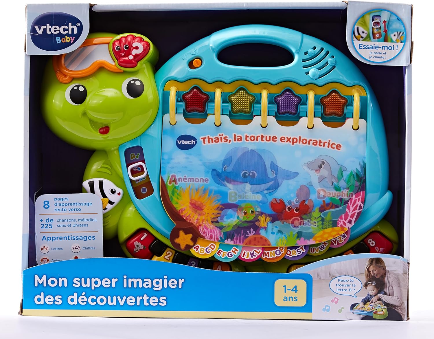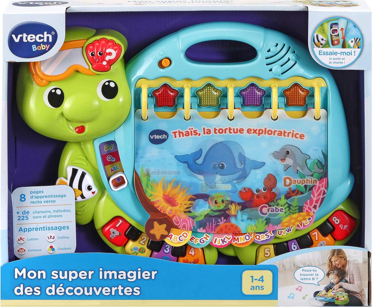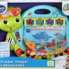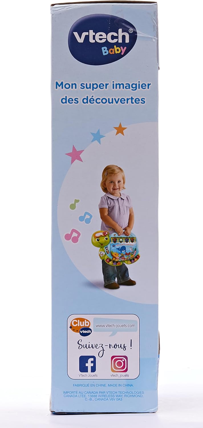 Dive into early reading with your toddler in the touch & teach sea turtle interactive story book. A holographic cover, bright colors and light-up buttons draw and hold your little one’s attention on eight double-sided book pages. Sea creatures fill this deep-sea story with learning experiences focused on letters, numbers, colors and animals with three learning modes. Press the piano key buttons on each page to hear the names of a variety of sea animals, listen to their sounds and practice counting. Go exploring with four light-up starfish and quiz questions that get little ones thinking and looking. Enjoy a robust 225+ songs, melodies, sounds and phrases in this take-along toddler book with carrying handle. Intended for ages 12-36 months. Requires 2 AA batteries. Batteries included for demo purposes only. New batteries recommended for regular use.