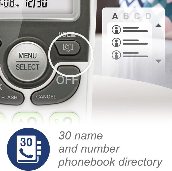 - Caller ID/call waiting—stores 30 calls – Know who’s calling with caller ID/call waiting. Handset displays the name, number, time and date of incoming calls. Also stores 30 names and numbers in the permanent phonebook directory to easily dial frequently called numbers.