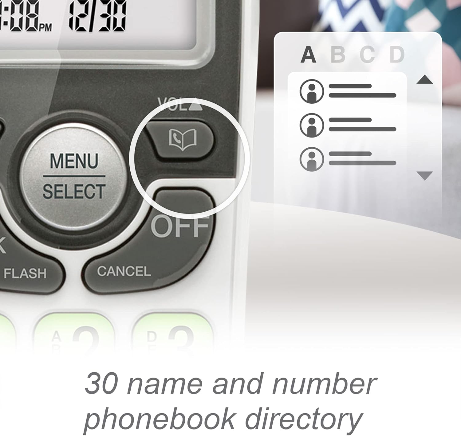 - Caller ID/call waiting—stores 30 calls – Know who’s calling with caller ID/call waiting. Handset displays the name, number, time and date of incoming calls. Also stores 30 names and numbers in the permanent phonebook directory to easily dial frequently called numbers.