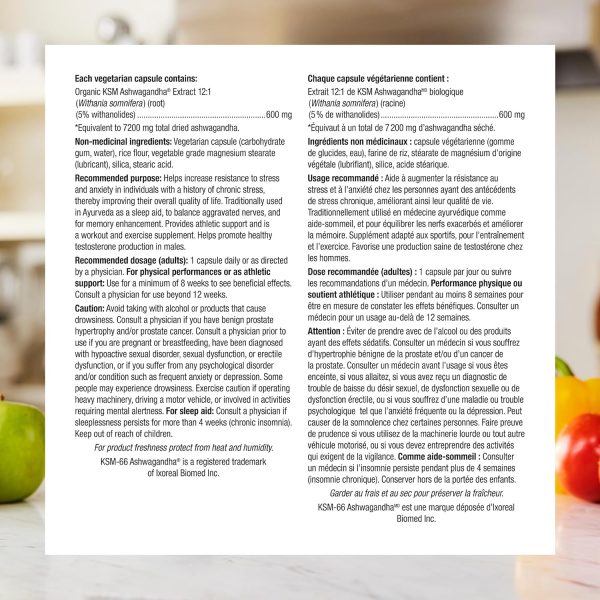 Ashwagandha from Webber Naturals provides organic KSM-66 Ashwagandha® to help increase resistance to stress and anxiety in individuals with a history of chronic stress. This herb is also used in herbal medicine as a natural, non-habit-forming sleep aid to balance aggravated nerves and enhance memory.Ashwagandha provides athletic support, helping to improve physical performance when combined with regular resistance training. This herb is also used in herbal medicine as a rejuvenative tonic and to relieve general debility, especially during convalescence and older age. In addition, it helps support libido and promote healthy testosterone production in males.Organic KSM-66 Ashwagandha is a full-spectrum extract made from only the ashwagandha root without the use of alcohol or chemical solvents. KSM-66 is one of the most clinically studied ashwagandha root extracts available, offering the same potency as used in multiple clinical studies.Ashwagandha from Webber Naturals is non-GMO and suitable for vegetarians and vegans. Only one capsule per day provides a 600 mg dose equivalent to 7200 mg of dried ashwagandha, standardized to 5% of withanolides.