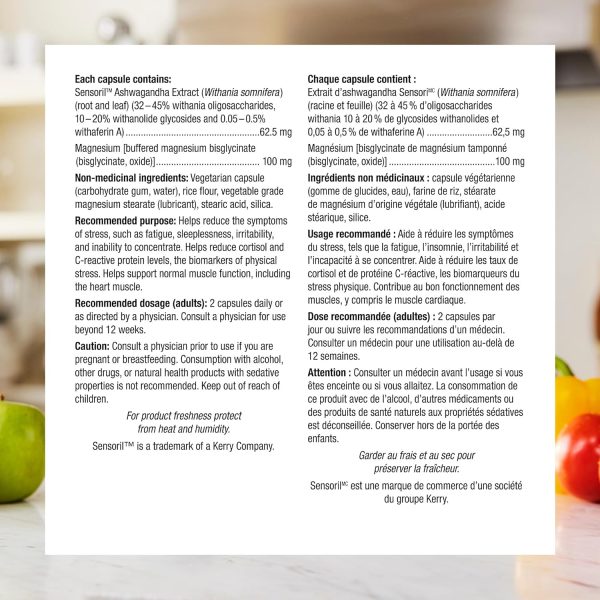 Ashwagandha + Magnesium from Webber Naturals features Sensoril™, a high-purity ashwagandha extract, alongside highly bioavailable magnesium to help support muscle function and energy metabolism. Sensoril is a well-researched, standardized extract of this adaptogenic herb. At least 16 clinical trials support its use to help reduce cortisol and the symptoms of stress, and help support cardiovascular health.