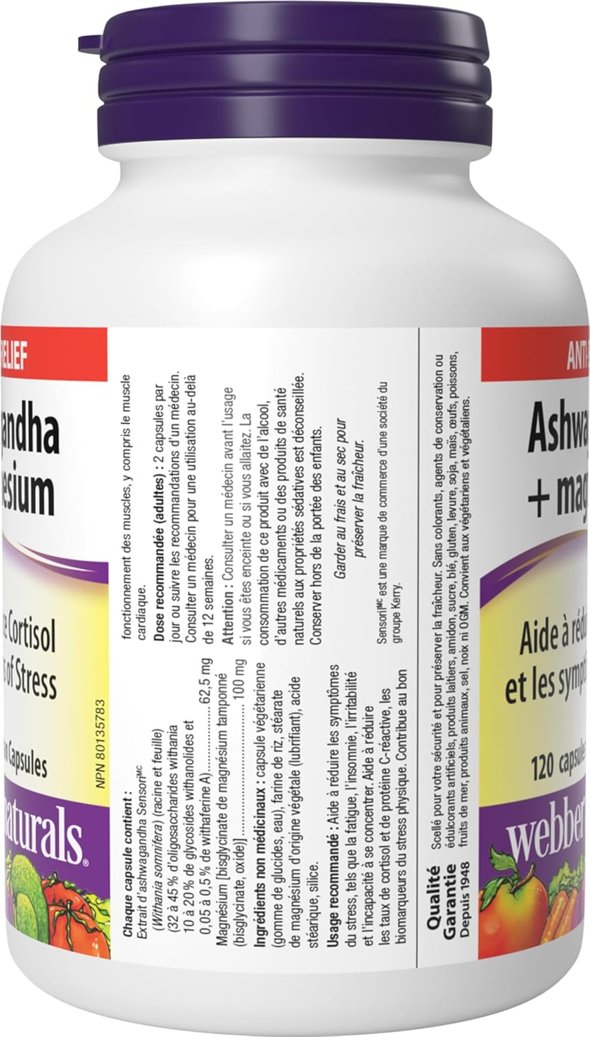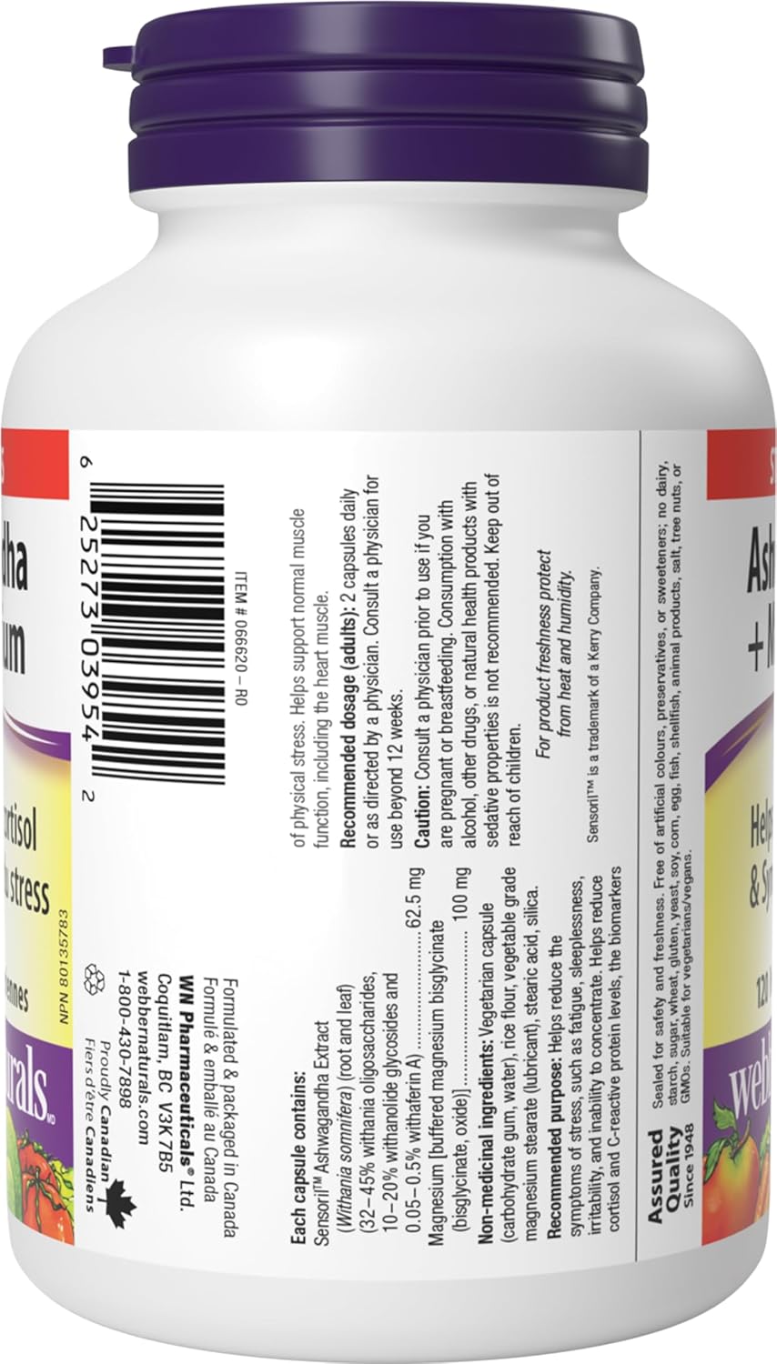 Ashwagandha + Magnesium from Webber Naturals features Sensoril™, a high-purity ashwagandha extract, alongside highly bioavailable magnesium to help support muscle function and energy metabolism. Sensoril is a well-researched, standardized extract of this adaptogenic herb. At least 16 clinical trials support its use to help reduce cortisol and the symptoms of stress, and help support cardiovascular health.