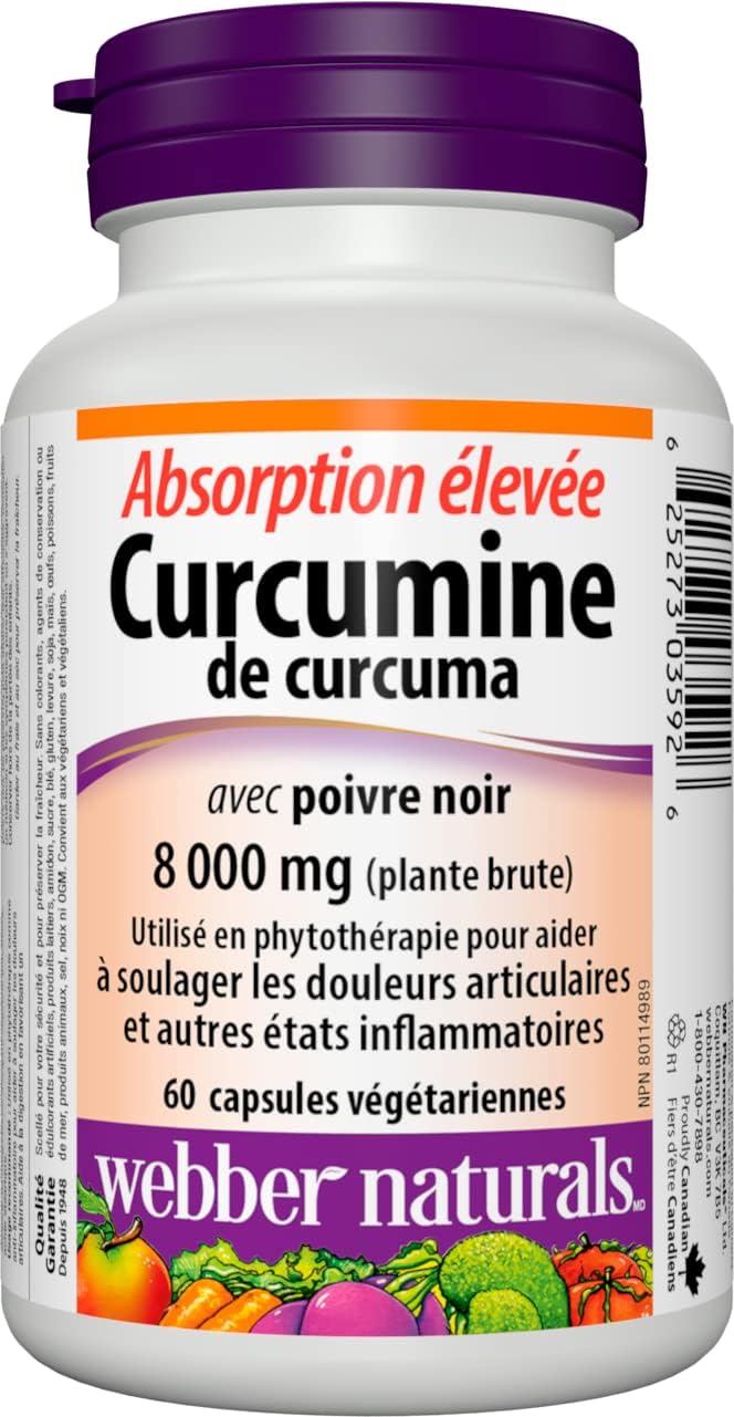 High Absorption Turmeric Curcumin with Black Pepper from Webber Naturals combines curcumin from turmeric with black pepper extract for enhanced absorption. Each vegetarian capsule contains 400 mg of 20:1 turmeric extract, equivalent to 8,000 mg of raw herb. Each capsule is standardized to 25% curcuminoids, one of turmeric’s most active constituents. Turmeric is used in herbal medicine to help relieve joint inflammation and provide antioxidant protection for the maintenance of good health.