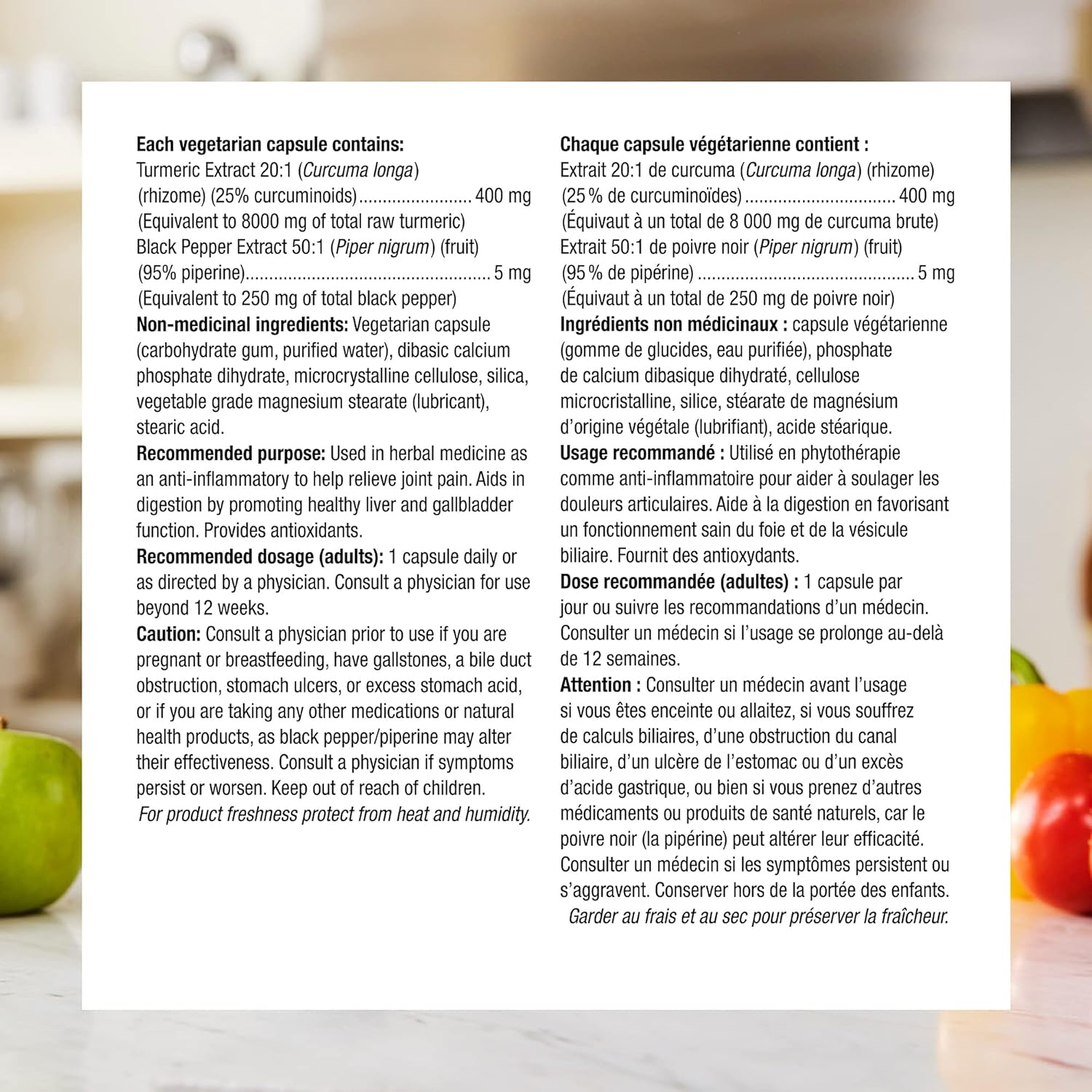 - Raw Herb Calculation: Each vegetarian capsule delivers 400 mg of turmeric extract standardized to 25% curcuminoids (raw herb calculation: 400 mg of 20:1 extract = 8,000 mg raw herb). Each capsule contains 5 mg of standardized black pepper extract for enhanced turmeric absorption
