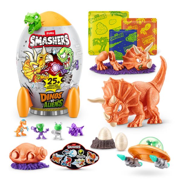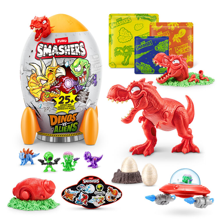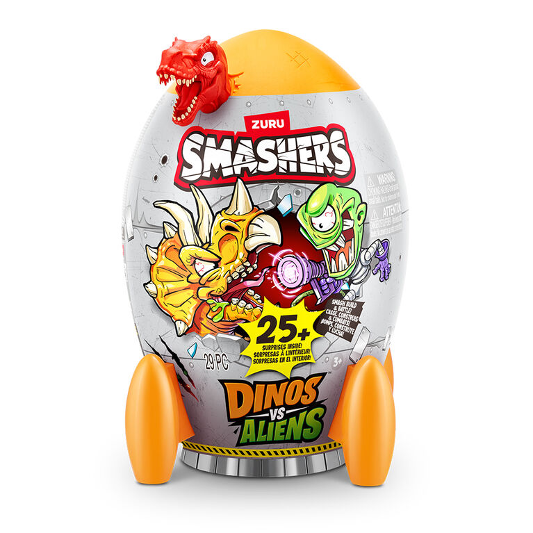 Blast off into an epic adventure with Smashers Dino VS Aliens! SMASH your way through a rocket ship to uncover dino parts hidden within layers of slime and sand. As you piece together the mighty dinosaur, get ready to meet the two mischievous alien characters and their fearsome UFO, each equipped with unique weapons. Prepare for an intergalactic showdown as your custom-built dino takes on the alien invaders in an action-packed battle. Unleash your imagination and determine who will triumph in this cosmic clash! With over 20 surprises inside and three dinos to collect, this is the ultimate addition to your Smashers collection.
